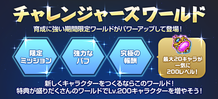 始めたときには既にチャレンジャーズワールド(通称:チャレ鯖)がオープンされてたので、自分と同じような新規だと、これが来たタイミングでメインキャラを育てて、それまでは色々な職を味見するのが良い気がする!
